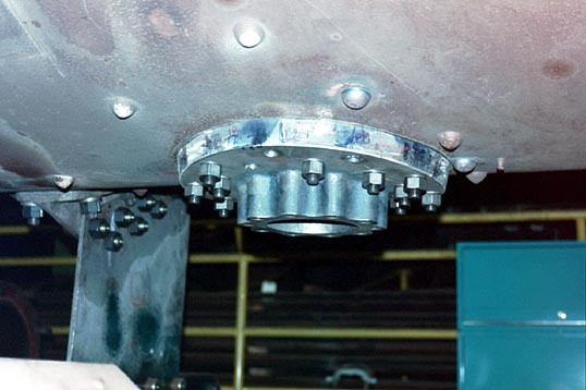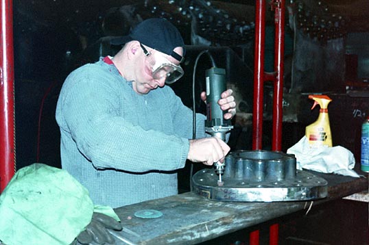 The front washout flange was test fit into place. Jeff Miller was honing the bolt holes of the rear washout flange on our arrival.