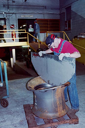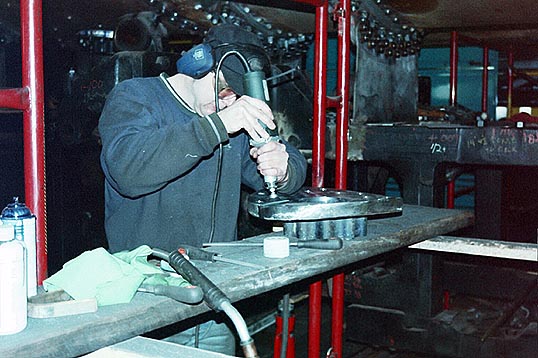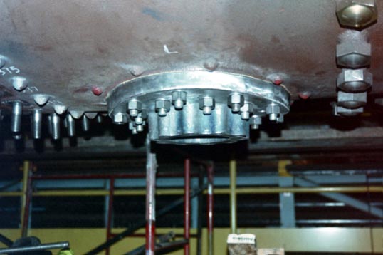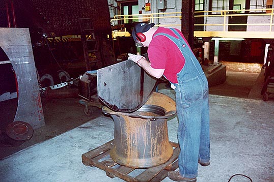 Chris Ahrens advised of the following: "Jeff Miller is off this week & part of next. The bottom washout casting received from the machine shop and are awaiting to be trial fitted to bottom of belly on 1st & 3rd courses. We have verbal approval on the dome course patch, awaiting written approval. The big step is get set up to do the pre-heat, welding & post heat treatment. One price away from sending drivers down to Tennessee Valley RR Museum for quartering, axle & crank pin etc replacement. (one of each). Small spring rigging parts are being machined. Jeff is finishing up riveting of the front tube sheet patch. The new stack is ready to pick up and apply." (posted 3/26/01)