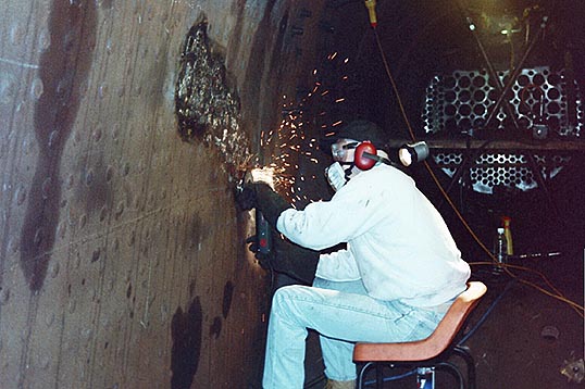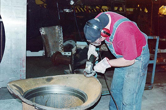 In the firebox, in the area where the fire bricks touched the side wall (both right and left sides), there had been slight deterioration. This was possibly due to acid and moisture from ashes or the bricks constantly striking the side. Jeff discovered that someone at sometime had placed weld over top of these areas. Because the weld was never ground down to be flush with the sidewall, Jeff ensured that this was done. After inspecting the area, he placed a thin layer of new weld in those areas.