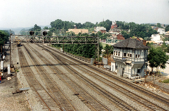 Alto tower, built in 1890, located at milepost 236.5 (17th Street), is the last manned interlocking tower on the the NS (CR) east slope and the last of 8 towers in the Altoona complex. Block operators have local control of over 50 trains per day as well as helper operations using Union Switch and Signal CTC boards. The grade here is 1%. A person may view operations from either on or beside the 17th Street bridge. 5 regular and 3 extra operators handle 5 inter-lockings (switches and signals) from here (Antis, Homer, Rose, Works, and Alto). It is said that these areas could not be controlled by computer due to the heavy traffic, the need to control and calculate the amount of helper engines (based on tonnages) needed to assist with trains ascending and descending the mountain, as well as taking into account maintenance and weather conditions. (Note that the track running south is the Hollidaysburg, PA Branch)