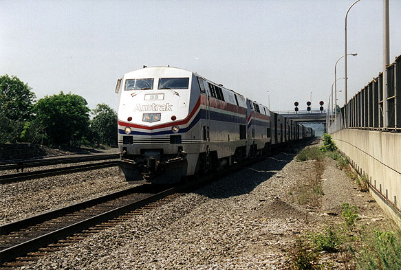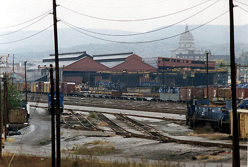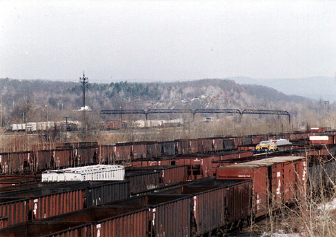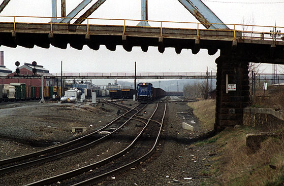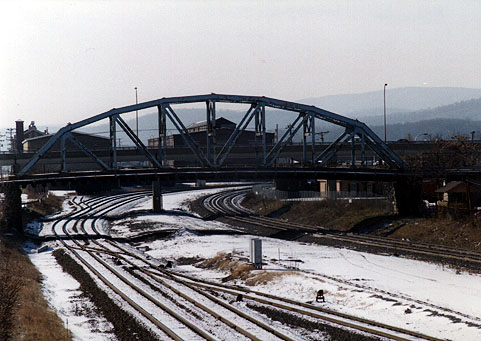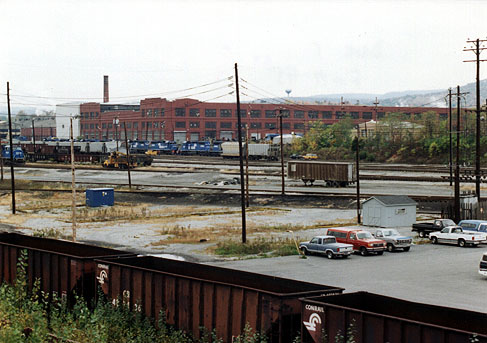 works_west-3.jpg (74120 bytes) Looking NW, an eastbound Amtrak ("The Broadway Limited") passes "works".  12/96  works_west-2.jpg (101552 bytes) A west bound view of "Works" from the 4th St bridge.  A helper set, moving eastbound,  shifts tracks.  3/13/97  works_west.jpg (63168 bytes) 7th Street bridge.   Looking West from the 4th Street Bridge.  11/29/96