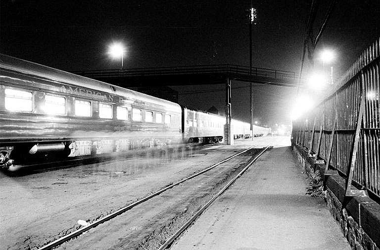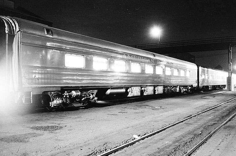 Altoona Station circa 1970. The Broadway Limited pauses westbound around 11 PM. Pictured is a diner from the American Railroads Golden Spike Ltd which toured the United States in 1969 to commemorate the laying of the Golden Spike at Promontory Utah. The various U.S. railroads contributed rolling stock for this consist. Penn Central RR contributed this diner (painted robin-egg blue with silver roof/trucks) as well as three ex-PRR B-60b baggage/exhibit cars [not shown]. Following the commemorative year, the loaned equipment, including this diner, was returned to revenue service.  Photo by David Seidel Another View of the Golden Spike Ltd.  Photo by David Seidel
