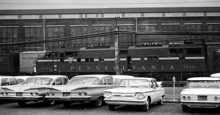 PRR Altoona round-house #3 as viewed from 17th Street Bridge.  Date unknown. Photographer unknown. William Burket Collection ca 1963 Eastbound Passenger PRR 12th St and 10th Avenue, Altoona PA ca 1963 Note Baldwin Shark's in dead-line headed to storage or for scrapping. Between 1965-1968 many of these were in storage in East Altoona. The car at the curb is a 1963 Chevrolet. Car back along curb is 1963 Ford. Nose of car at immediate right is probably a 1956 Buick with bombsight hood ornament slightly recessed.