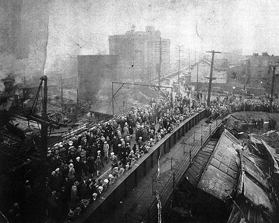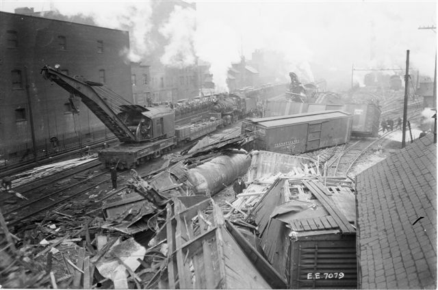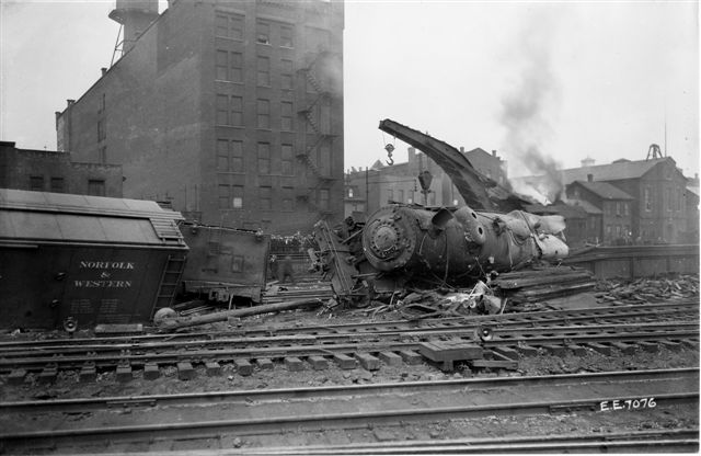 On November 30, 1925, The wreck occurred when an eastbound freight train "lost its air" descending the East Slope and ran away, derailing and striking the old Seventeenth Street Bridge moving it 32 inches off its foundation. The bridge had to be rebuilt before it could be used for vehicular traffic again. Date is circa 1927.  Photographer unknown. William Burket Collection.