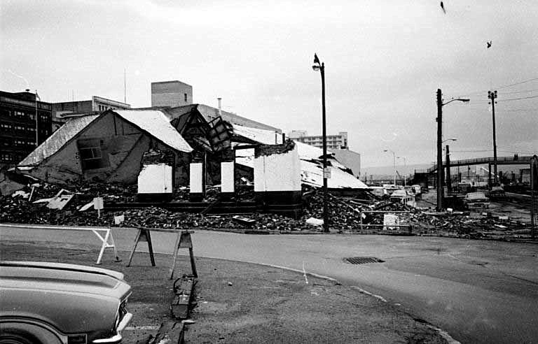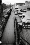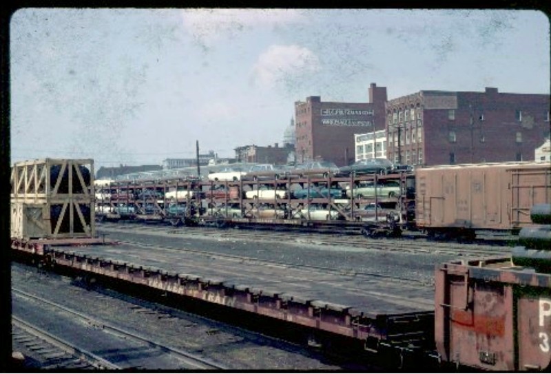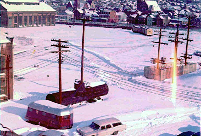 1972: A few days prior to station demolition, from old 12th St Bridge. The post office area was formerly occupied by the PRR's Logan House Hotel pre-1931.   This linear area was replaced by present day PRR Expressway along the RR. The track that curves in through the station area (one of which would have passed under the ornate shelter canopy [razed April 1961] was also a casualty for the expressway. The girder bridge (17th st) in the distance was also replaced for the expressway, and the large building to the left of the girder bridge was the PRR Test Department, also razed in the early 1970's, all of which was part of the "re-development" of the city's infrastructure. The remaining shops at Twelfth St (site of present day museum and Station Square) were also razed at that time as well as much of the area near Altoona High School and the "corridor" for present day 17th St. (16th Street was eliminated from 4th Avenue to 12th Avenue in this process). Eleventh Avenue between 11th St and 12th St was totally razed and eliminated. That's 'another' slide show... 1972....Altoona Station "on the ground". View east on old 10th Ave at 13th St. In this interim period, the replacement station was a trailer near 12th St. When Amtrak arrived after the Penn Central bankruptcy, we affectionately referred to it as Amshack! View from 11th Avenue