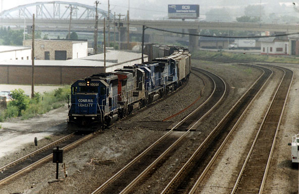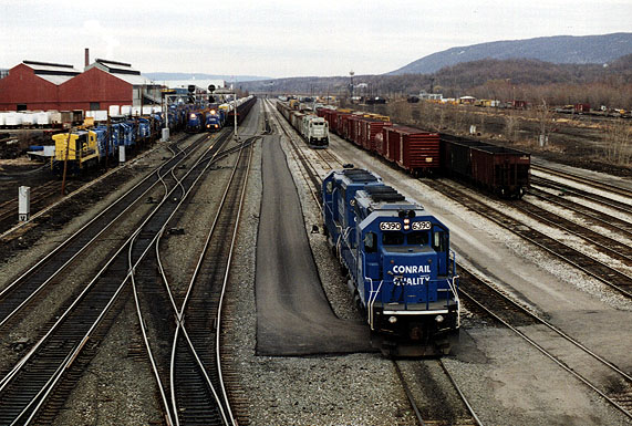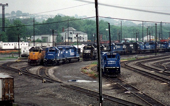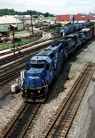 Today, Conrail’s Juniata Locomotive Shop is the most modern locomotive heavy repair facility in the railroad industry. Juniata’s capability includes repair and overhaul of complete locomotives, traction motors, main generators and alternators, diesel engines, power assemblies, air brake equipment, engine governors, fuel injection equipment, fans, blower motors, and virtually all of the other components used on Conrail’s own fleet of locomotives as well as for a variety of commercial contract customers who take advantage of Juniata’s Insourcing Program, which began in 1990. In 1995, the Juniata Locomotive Shops received a contract from EMD to assemble, test, and paint brand new SD60I locomotives. This group of units were the first new locomotives to be built completely at the shops since 1946. (From 1891 through 1946 over 7,000 locomotives of all types were built from the ground up at Juniata.).