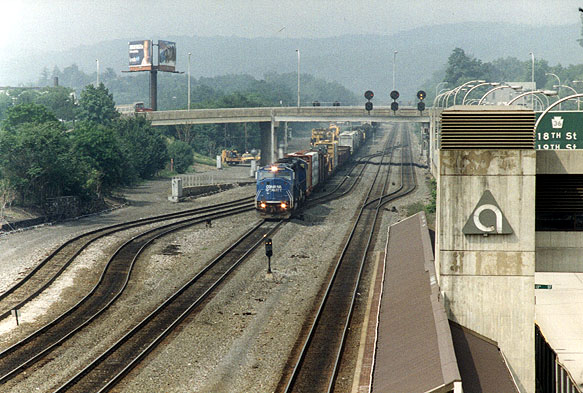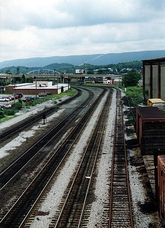 8th_St-west.jpg (82261 bytes) Helpers on the rear of a Westbound Freight.  Viewed from 9th Street.  Looking NW.  (4/13/97) 11st.jpg (77133 bytes) An Eastbound Triple Crown (CR,CSX,NS) "Roadrailer" consist.  Viewed from 10th Street.  Looking SW.  (6/3/98)