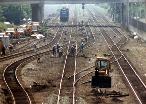 station_wreck-1.jpg (68788 bytes) Track crews making repairs after the 7/13/95 derailment in front of the Transportation Center.  Looking West.  (7/14/95) station_wreck-2.jpg (69781 bytes) Track crews making repairs after the 7/13/95 derailment in front of the Transportation Center.  Looking West.  (7/14/95) wreck_at_17th_St_1927.jpg (77540 bytes)  FREIGHT TRAIN WRECK at 17th STREET BRIDGE ALTOONA, PA