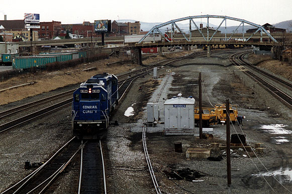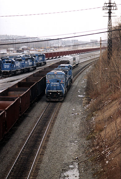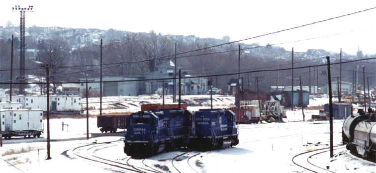 Juniata_pass_mains-2.jpg (91052 bytes) A westbound helper set passes "Rose"  and a stopped Eastbound empty coal train.  Both trains are on the old "passenger mains".  Looking West from the 8th Street Juniata Bridge.  12/12/97 Juniata_Wb_Depart_yd.jpg (70411 bytes) Looking West to the old "Westbound Departure Yard" from the 8th St Juniata Bridge.  Date Unknown Juniata_Pgh_Cabin_trk-2.jpg (81878 bytes) The old "Pittsburgh Cabin Tracks" are visible in this SW view Looking  towards the Juniata Scales ("JS").  Date: Unknown