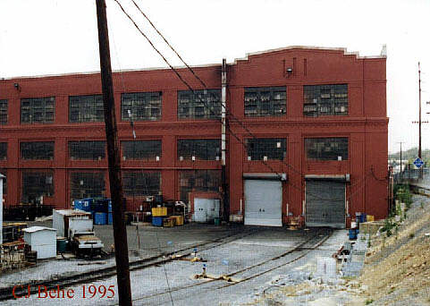 In the wake of the Penn Central Merger, NYC #4016 and PRR G5 #5741 sit at the Juniata E&M shops. 6-16-1969  By David Seidel EandM_looking_S.jpg (39852 bytes) The E&M Shop.  Looking South from the employee's parking lot.  Fall 1995 EandM_looking_SW-1.jpg (31079 bytes) The E&M Shop.  Looking Southwest.  Fall 1995