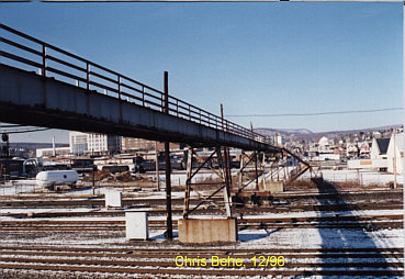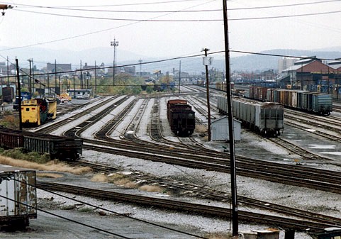 works_wb_eb_pref_yd.jpg (100952 bytes) A view of the old "West and East Bound Preference Yards" from "Works.  A Westbound freight waits at the signal bridge as a priority westbound freight passes.  A helper set waits on a shifting track.  Looking East from the 4th St Bridge.  3/13/97  works_eb_pref_yd-2.jpg (84130 bytes) A view of the old  "Westbound Preference Yard".  Looking NE from the 4th street bridge ("Works" / "South").  11/29/96  works_eb_rec_yd.jpg (73138 bytes) A view of the entrance to the old "Eastbound Receiving yard" from the 4th street bridge.  Looking East.  Date unknown.