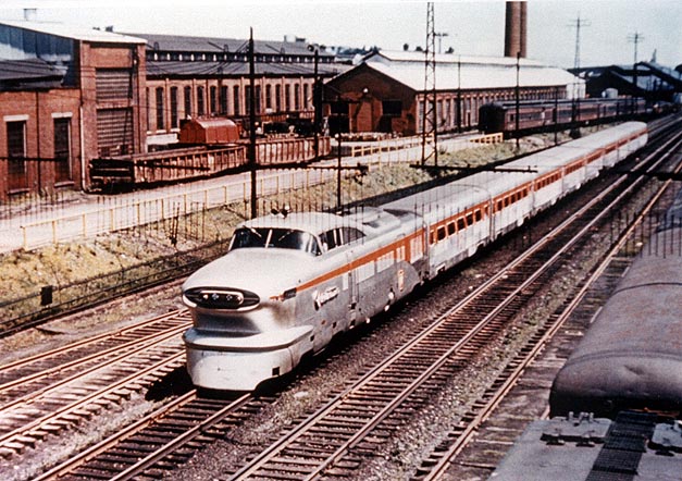 EMD_GP_from_7st_look_e.jpg (48995 bytes)  PRR GP units heading a westbound coal train at 7th Street.  Looking East. Note the abundance of passenger equipment present.  Date unknown. Arlington J. Wolfe photograph.   William Burket Collection.     Aerotrain_WB_7st.jpg (104070 bytes) A view of the "Aerotrain" passing Westbound under the 7th St Altoona Bridge.    Date unknown. Arlington J. Wolfe photograph.   William Burket Collection.