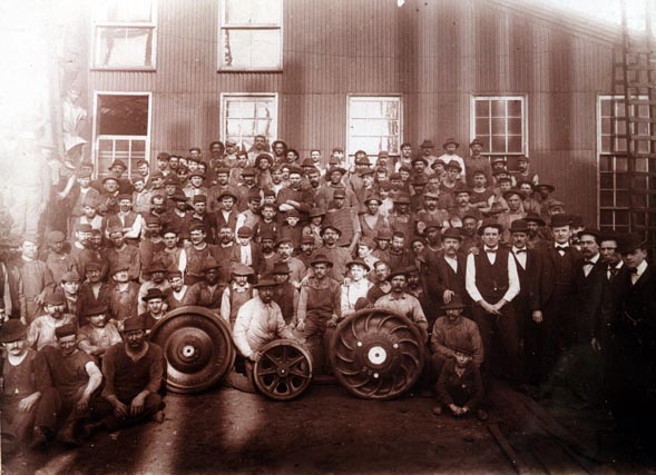 M1_6340_eb_24th_st.jpg (66257 bytes) PRR M-1 #6340 headed eastbound at 24th Street.  Note the water tower on the hill.  Date unknown. Arlington J. Wolfe photograph   William Burket Collection Triple_I1_at_Slope_WB.jpg (60247 bytes) Triple L-1's Westbound Approaching "Slope" Tower.  Arlington J. Wolfe photograph.  . William Burket Collection.   S-Altoona_Wheel_Foundry_1900s.jpg (62445 bytes) South Altoona Wheel Foundry.  Circa 1900.  The Fifth supervisor from the right side (front row) is of Harley E. Burket.  Grandfather of Harley W and William E. Burket.  Arlington J. Wolfe photograph.  William Burket Collection