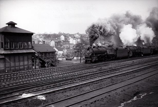 ADDENDUM; During 1968, the Penn Central Merger year, many PRR structures and facilities in the greater Altoona area were razed. Among the most notable losses to the city were the PRR Test Department on 16th Street, and the famous steam locomotive test rack, which was housed in a separate building at the rear of the Test Department laboratories.  The locomotive test rack was the only one of its kind in the world and was designed as an exhibit for the St. Louis Exposition in 1904. When the exposition ended, the test rack was shipped back to Altoona and installed in the new Locomotive Test building at the PRR's Test Plant. A recollection of Mr. Dale McCracken, Foreman of the East Altoona Roundhouse, "only the best engineers and firemen were ever assigned to the test rack to operate locomotives undergoing tests. Many engineers vied for this position, for the man thus assigned was considered the best in his line." One of the last steam locomotives tested on the rack, was the experimental class Q-2 which showed a maximum of 7,897 horsepower at a speed of 57.4 mph. This was the greatest horsepower developed by any locomotive at that speed. However, many locomotive tests were run at speeds of 100 mph and the plume of coal smoke from the buildings ventilation chimney was a familiar site to Altoonans as was the roar from the structure. (Submitted by David Seidel; from his Altoona Mirror acrhives)