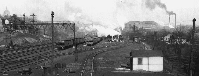 EMD_Es_passenger_wb_from_7th_St.jpg (48340 bytes)  PRR E-8's heading a westbound passenger train at 7th Street.  Looking East.  Date unknown. Arlington J. Wolfe photograph.   William Burket Collection.     2-EMDs_from_7th_st_look_e.jpg (51468 bytes)  PRR GP units heading a westbound coal train at 7th Street.  Looking East. Note the abundance of passenger equipment present.   Date unknown.  Arlington J. Wolfe photograph.  William Burket Collection   SW_switcher_from_17st_jun_bridge_look_e.jpg (43273 bytes)  SW Switcher.  Looking west from the 7th Street Bridge.  All the siding tracks at extreme right are the leads into the