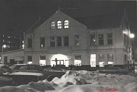 Take a look at the window in the lower left hand corner of the building. Note particularly how close to the track it is. I would say 15 feet would be a good guess as to how close to the CENTERLINE of the track that window was. Well, that happened to be the Trainmaster's Office. Not only was it the Trainmaster's Office, but the TM, Ralph Decker in those days, used to sit in his chair with the back tilted up against the windowsill and his head literally resting against the glass.