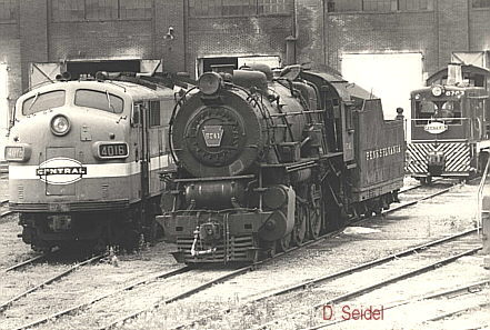 In the wake of the Penn Central Merger, NYC #4016 and PRR G5 #5741 sit at the Juniata E&M shops. 6-16-1969.  By David Seidel. Jan. 27,1950...A steam engine approaching Juniata, looking east off of the 8th. Street bridge in Juniata. (NOTE: Tom's pages have been taken off line but can still be found via the Internet Archive Wayback Machine.) 1939...The S1 locomotive as seen from the 8th. street bridge in Juniata , near Altoona, in 1939, just before it went to Flushing , NY. for the 1939 World's Fair, where it was ran on a specially built treadmill for display.  This was designed by Raymond Loewy, built in the Juniata Shops, and it was almost twice the size of the K4 locomotive.  The PRR only made one of these, (this was #6100),and this only ran for four years before it was cut up for scrap.(NOTE: Tom's pages have been taken off line but can still be found via the Internet Archive Wayback Machine.)