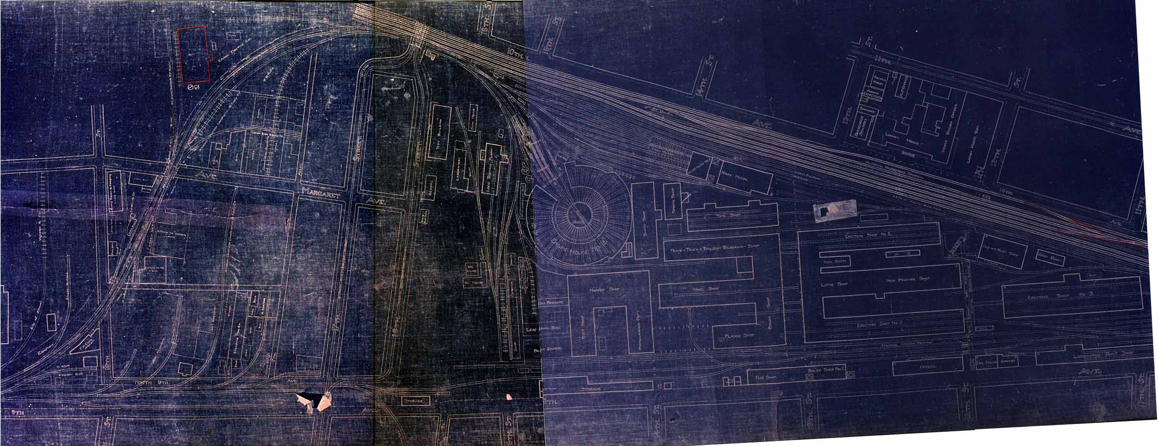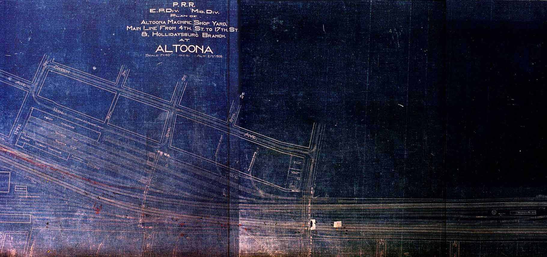 | This view encompasses the Hollidaysburg Branch from 19th Street to 17th Street & the Mainline from 17th Street to 11th Street Altoona. This includes the 12th Street Altoona Shops. Dated 2/1/1908. William Burket Collection. | This view encompasses the Mainline from 11th Street to 4th Street Altoona. This includes the freight warehouses along 11th Avenue, Altoona. Dated 2/1/1908. William Burket Collection. |