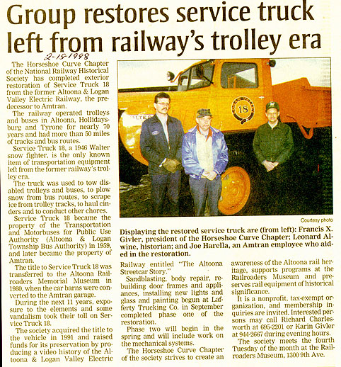This vehicle was Service Truck No. 18 of the Altoona & Logan Valley Electric Railway and is the only surviving operational equipment from Altoona's trolley operations which concluded street-rail operations in August, 1954.