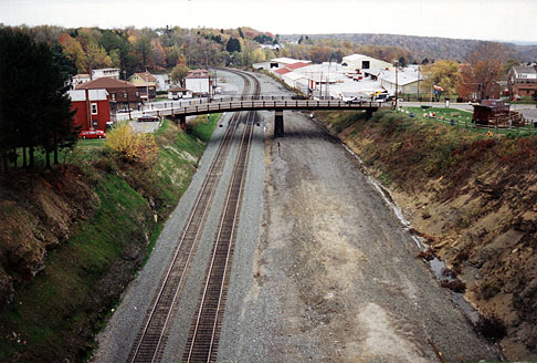 The old right of way for the New Portage Secondary (at "SF" interlocking", milepost 247.2) was the alternate route over the Mule Shoe Curve to Hollidaysburg, PA. The track was removed in 1984. A Map of the "SF" Interlocking / New Portage interchange is Available Here.