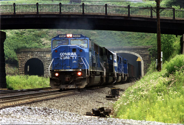 The Conrail Pennsylvania Clearance Improvement Project began on June 20, 1994. This project consisted of modifying the Allegheny Tunnel in an effort to lower the track and give clearance for the higher, double stack trains. The work used much more sophisticated equipment than a pick and shovel and the crew consisted of about 90 people. "While work was progressing on Allegheny Tunnel, westbound and eastbound trains used Gallitzin Tunnel; its track had been connected to track 2 just east of UN inter-locking, and since track two is signaled both ways, some of the eastbound traffic was able to use Gallitzin Tunnel. It wasn't until Allegheny Tunnel was placed in service that the other one was taken out of service. Thanks again, and feel free to contact me if I may be of further assistance. "(Phil Faudi) After the improvements, the Gallitzin tunnel was taken out of service. The track was subsequently removed.