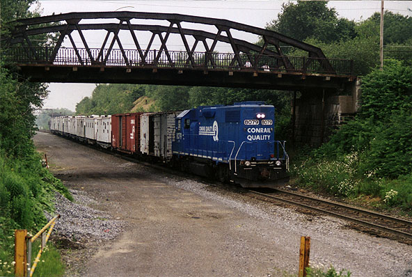 "A Conrail eastbound is seen exiting the east side of the Portage tunnel, over the former New Portage Secondary, and proceeding down the slide."