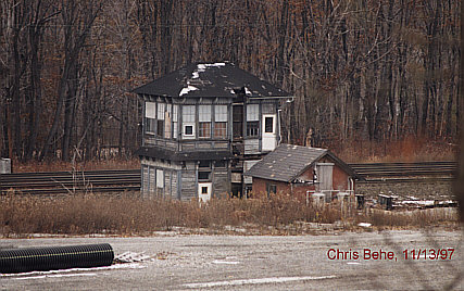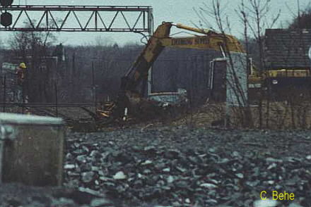 " MO" (Cresson, PA) Tower Razed: "MO" (Mountain) tower at Cresson had been vacant for several years due to the advent of fibre optic signaling. While traveling through Cresson on 12/7/98, I observed Conrail crews cleaning up the raised structure. This tower had served as a control point for trains operating between "AR" tower (Allegheny Ridge) / " UN Interlocking" (both located at Gallitzin, PA) and " SO" (South Fork) tower. A citizens group in Cresson attempted to save it and hired Earl Miller House-movers from Everett to attempt to have it placed at the park on Front Street and Keystone Avenue in 3/97. However, internal structural deficiencies were present, and on attempt to move, the tower started to collapse. It was not structurally sound. Cresson had prepared a pad for it along Front St., but the project had to be abandoned. (by Chris Behe and David Seidel; posted 12/28/98)