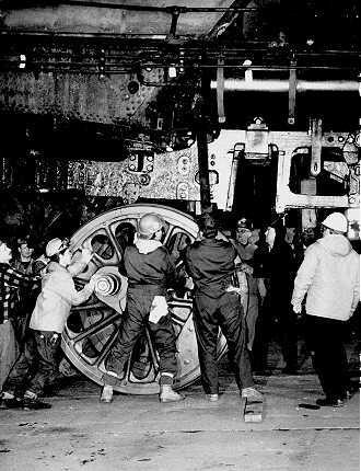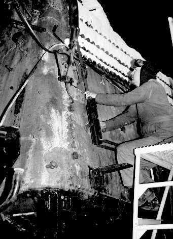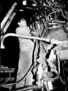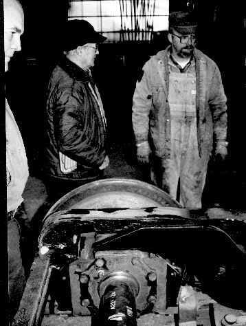 1986 K4 Locomotive # 1361 restoration at Conrail's Altoona Car Shop. Project Director Roy Price examines the stoker screw for the locomotive. Photo by David Seidel |