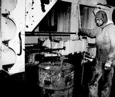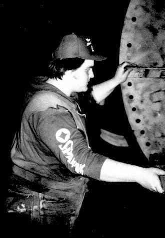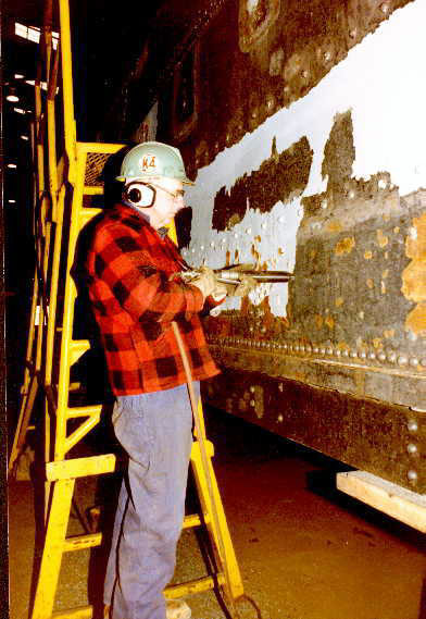 Feb 1987. Dave Seidel using needle gun to remove paint from intended auxiliary tender. Conrail Altoona Car Shop. Photo by Denver Thompson |