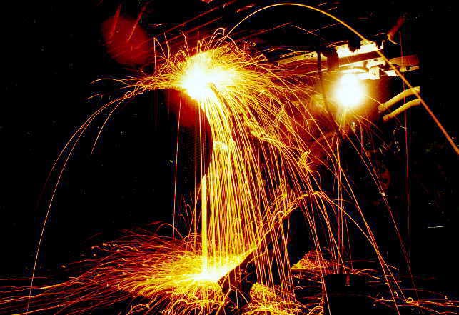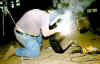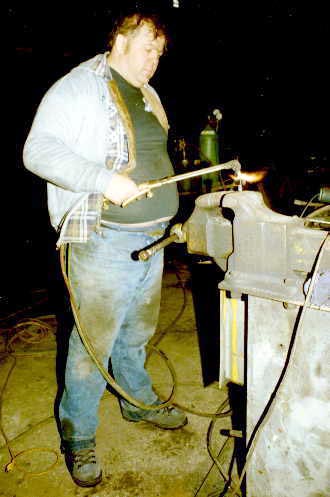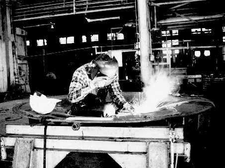Photo of volunteer Anthony "Tony" Febbo, welding a patch on smokebox door of ex-PRR steam locomotive No. 1361 during the 1986/87 restoration. Photo by David Seidel |