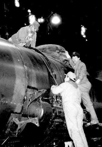 Photo of Doyle McCormick and C. J. Moore (now deceased) working on K4 # 1361 during the 1986/87 restoration at Altoona (Conrail) Car Shop. Doyle McCormick, of Portand, OR was the project expert directing the restoration. Photo by David Seidel. |
