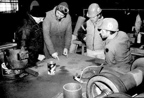 Mr. Lloyd Murray, former PRR steam machinist, Altoona, confers with Doyle McCormick during the 1986 restoration of steam locomotive class K-4s # 1361. Two workers at right are unidentified. Photo by David Seidel winter 1986-87 |