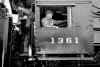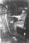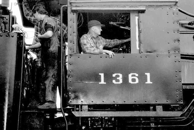 Photo of Elbert "Red" Leighty trying out the engineers seat in the nearly ready K-4 # 1361 at Altoona Car Shop (Conrail). Mr. Leighty, a volunteer on the 1986/87 restoration project, died in 1997. Standing at the rear of the locomotive cab (front) is Joe Musser. Photo by David Seidel |