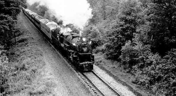 Photo of a summer excursion by ex-PRR steam locomotive No. 1361, a class K-4s, northbound on the Nittany & Bald Eagle RR approximately one mile north of Vail, Snyder Twp., Blair County, PA. Photo by David Seidel |