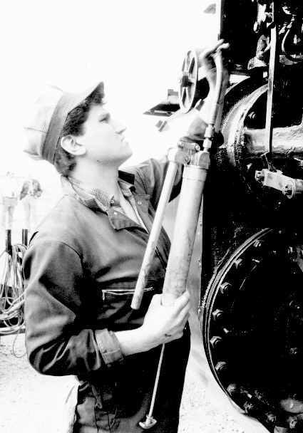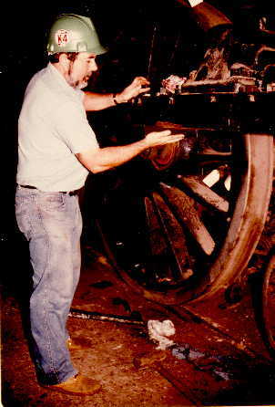 Photo of project worker Dick Yager of Milwaukee, WI, during 1986/87 restoration of ex-PRR steam locomotive # 1361, Class K-4s. Mr. Yager was an associate of Doyle McCormick in the restoration of steam locomotives. Photograph by David Seidel |