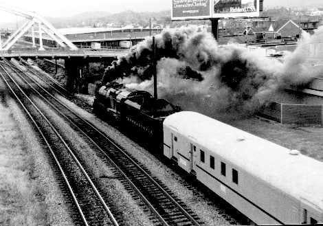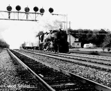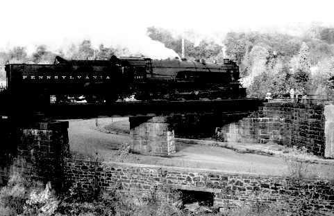 June 21, 1987, K4 # 1361 eastbound on the Conrail Main at Fostoria, east of Bellwood, Pa., enroute to Tyrone (Vail) to head another excursion train to Bellefonte on the Nittany and Bald Eagle RR (former PRR Bald Eagle Branch). Approximate speed of locomotive at this location 60+ mph, and barking smartly. Photo by David Seidel |