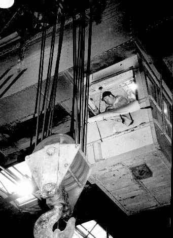 1986 project for K4 # 1361 restoration at Conrail's Altoona Car Shop. Jim Gottshall Jr. operates the overhead 25 ton crane. Photo by David Seidel