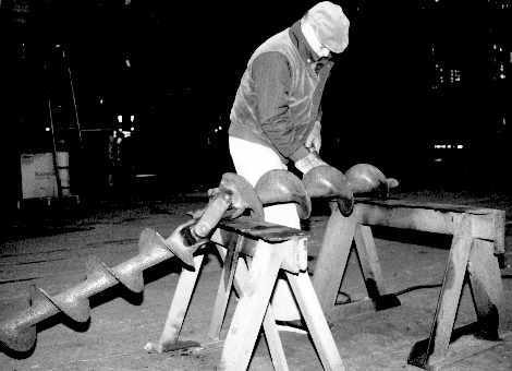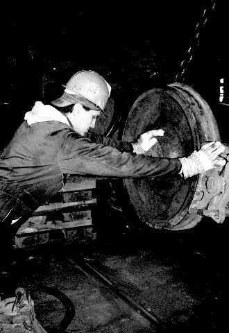 "Junior" Gottshall (James Gottshall Jr) of Catawissa, Pa., working on journal boxes for K4 # 1361 tender at Conrail's Altoona Car Shop during 1986. Photo by David Seidel |