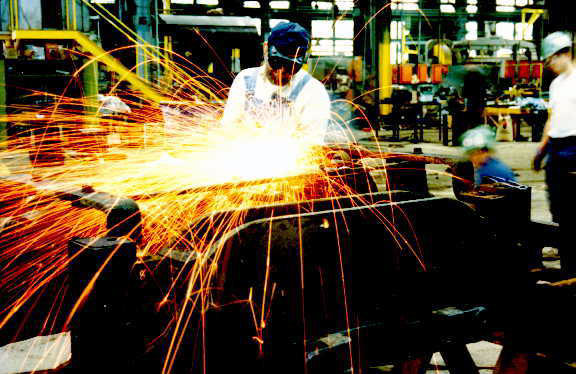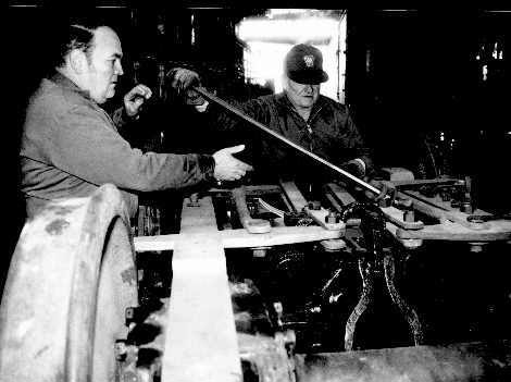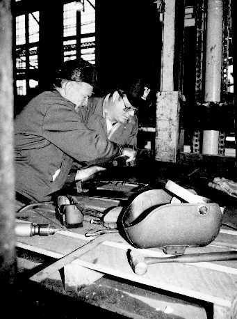 1986 Doyle McCormick and Ronald L. Ray Sr cutting sheet metal for K4 jacket at Conrail's Altoona Car Shop. Photo by David Seidel |