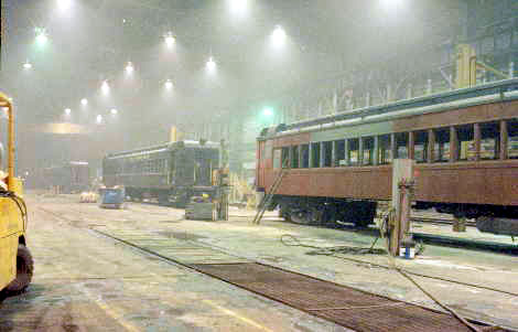 March 1987. Interior of Conrail Altoona Car Shop where most of the K-4 restoration work was completed. With the K4 moved outside for tests, work progressed on coach rehabilitation by Horseshoe Curve Chapter NRHS. Sand blasting and repainting were necessary prior to the inaugural run of the K4 on 4-12-1987. Photo by David Seidel |