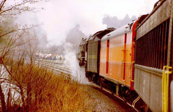 4-12-1987 K4 # 1361 approaches Bellefonte, PA on the inaugural run. Doyle McCormicks SP tool car, the "Yes Dear" adds color to the consist on a dreary, rainy day although to all volunteers riding the shakedown operation, the sun was shining brightly. Photo by David Seidel