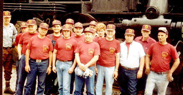 June 21, 1987. The K4 crew poses at Bellefonte, Pa., after a successful run. Crew, left to right: William Withuhn, Engineer; Wayne (Tim) Reese (deceased), Dave Musser (deceased), Pete Pontius, Paul Ferry, Harry MacIntosh (front), Jack Hatch (rear/not visible), Tony Febbo, Leroy Duffy (front), Denver Thompson (rear), Joe Musser; Roy Price K-4 Project Supt; Ed Wilt (Light Shirt)-President Keystone Restoration & Preservation (KR&P), present day K4 crew organization; Les Shaffer, and Jeff Pontius. Photo by David Seidel |