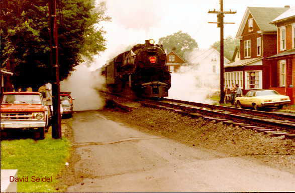 7-87 K4 1361 arriving Tyrone Pa, headed northbound on the former PRR Bald Eagle Branch. Scene is along Washington Avenue where RR runs down center of street from Station area toward the Westvaco paper mill. On this occasion, as light rain was falling and created traction difficulties for the K-4 during the next several town blocks. Photo by David Seidel |