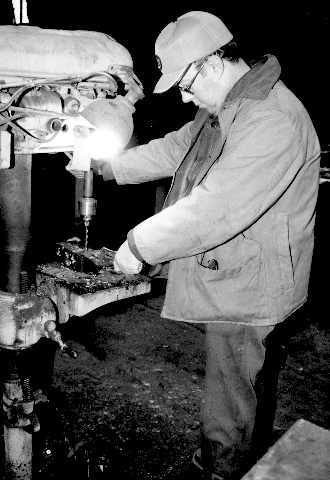 1986. Volunteer Bill Temple works at the drill press on the K4 # 1361 project in Conrail's Altoona Car Shop. Photo by David Seidel |