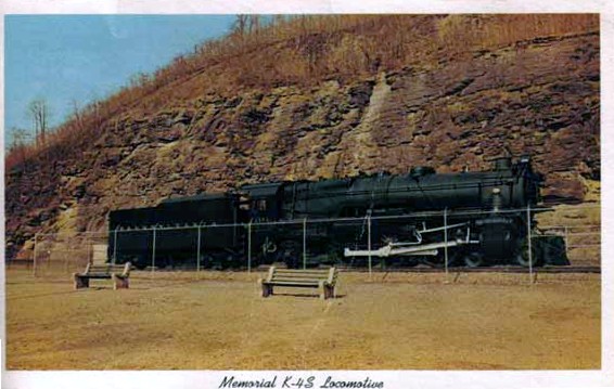 "This is the K-4 at Horseshoe Curve circa 1977 (estimated) when the Horseshoe Curve Chapter was assisting the City of Altoona in maintaining [cosmetically], the K-4. In those days, as a public service to the city, the Chapter furnished manpower and the city furnished paint. We chipped, wire-brushed and painted the locomotive, and maintained the spotlights around the locomotive. Many a Saturday night we were up there late and this is one of those occasions." David Seidel Photograph |