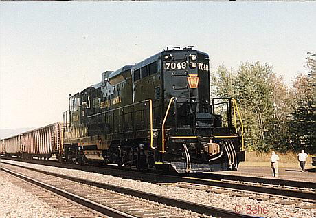 PRR GP-9 #7048 at "Slope" on 9/30/1985. Awaiting placement at Horseshoe Curve. |