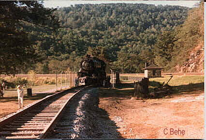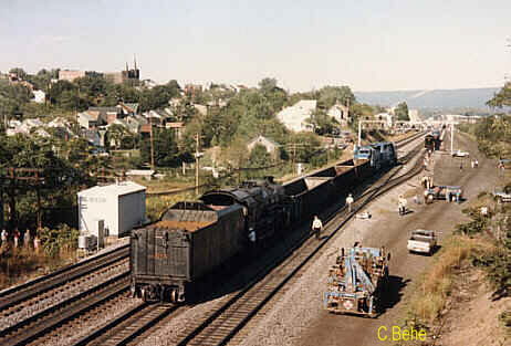 Here the K-4 is in the process of being moved onto the main line. However, a problem with the temporary track caused a derailment. Crews are in the process of repairing the track. 9/30/1985 |
