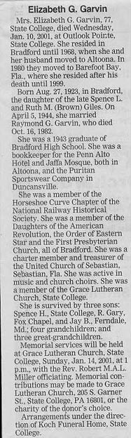 "A longtime friend of the Horseshoe Curve Chapter, NRHS and of Altoona Railroader's Memorial Museum, Elizabeth Garvin, died January 10, 2001 in State College, PA. Mrs. Garvin has been in failing health during the past year, during which time she relocated from Barefoot Bay, FL to State College, PA, to be near family.