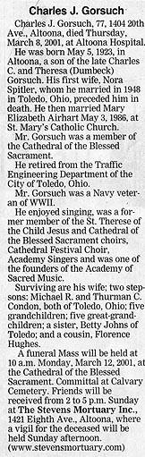 Charles and "Libby" were great friends and across-the-alley neighbors of your Chapter Historian and will be greatly missed. I only knew Charles and Libby since Charlie's return to Altoona (1986?) but we developed a bond and enjoyed each other's company a great deal. It is hard to realize that last week through March 8, 2001, my friends lived across the alley. Less than one week later, no one lives there. One of Charles's passions was singing in the church choir, first at St. Therese' Altoona and, in later years with the choir at the Cathedral of the Blessed Sacrament where his mass of Christian Burial was celebrated on March 12, 2001.