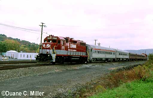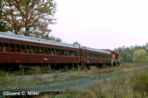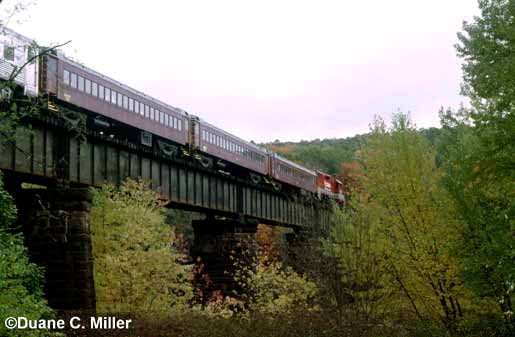 On Monday, October 28th, they returned the chapter coaches to the interchange with Norfolk Southern at Cresson. For this dead-head move they sold tickets and then had buses meet the train in Cresson to return the passengers to Clearfield. As of Saturday they had only sold approximately 50 tickets but over the weekend they sold enough additional tickets to require four buses to return the passengers to Clearfield. To reach Cresson they again followed the B&O line from Clearfield to Curwensville, and then NYC line from Curwensville to Mahaffey. At Mahaffey the train then went onto the former PRR line through Westover and Patton. Aboard the train we noticed a car with an out-of-state license plate that was meeting the train at each crossing to photograph the train. By the time we was nearing Cresson, everyone was cheering when the car was spotted. On this excursion there was the three chapter coaches and two RJ Corman locomotives on the front end.  By Duane C. Miller